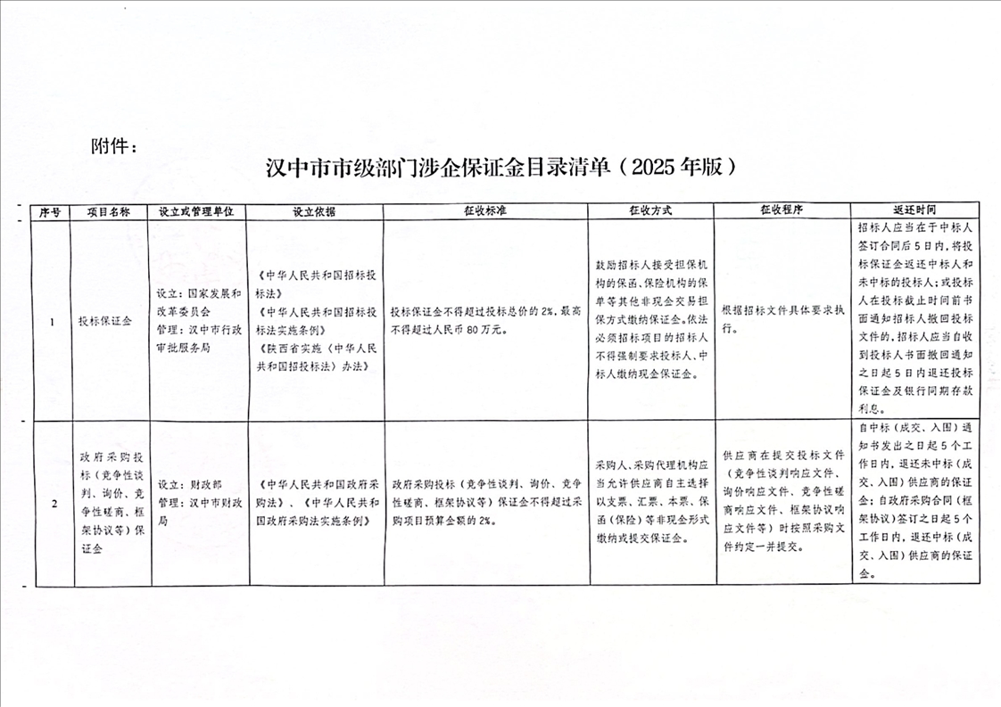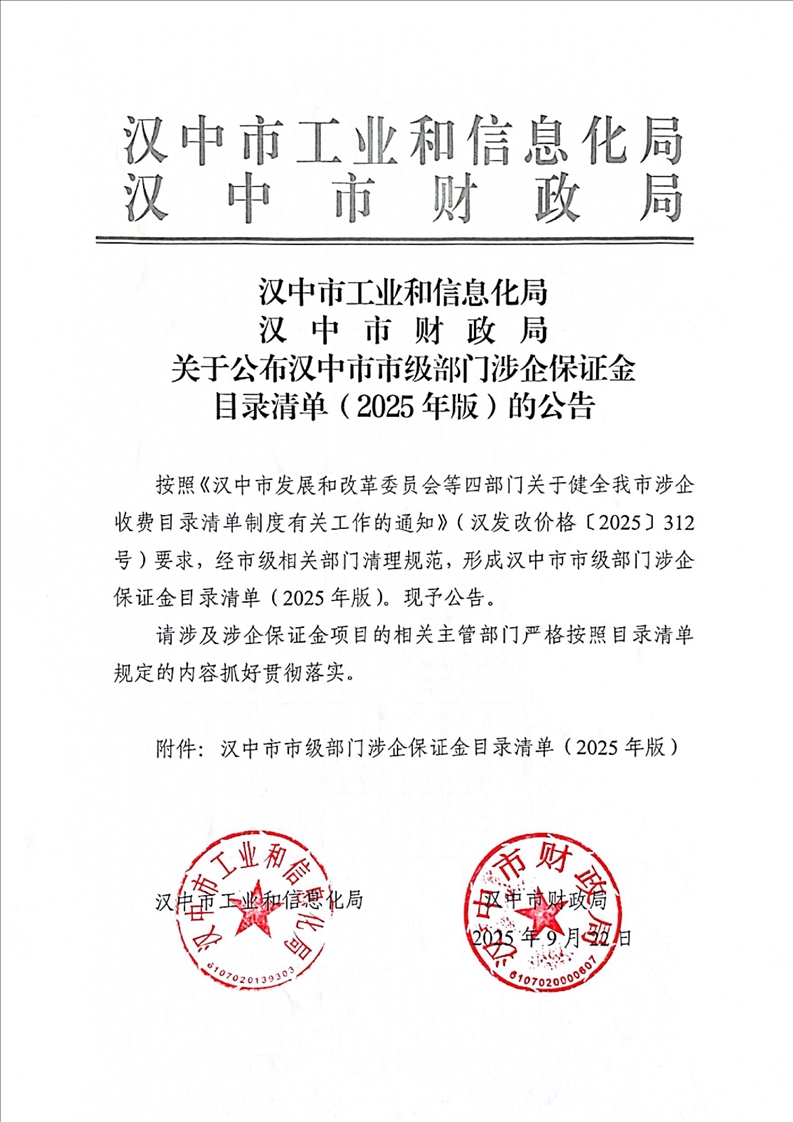 关于公布汉中市市级部门涉企保证金目录清单(2025年版)的公告